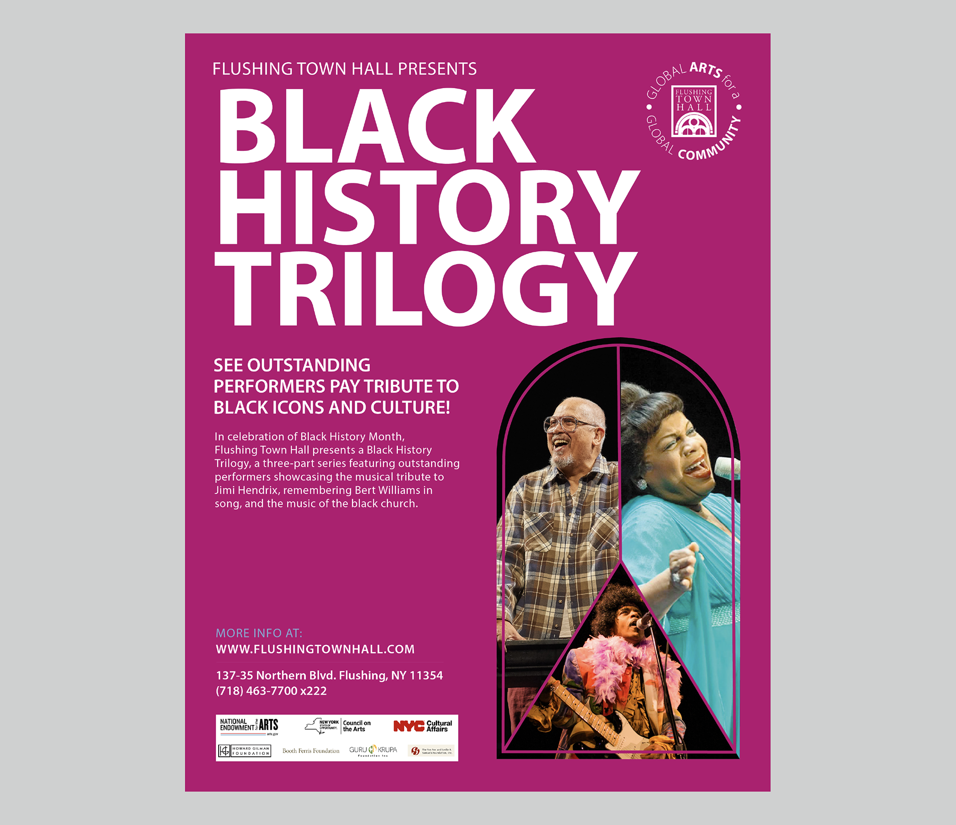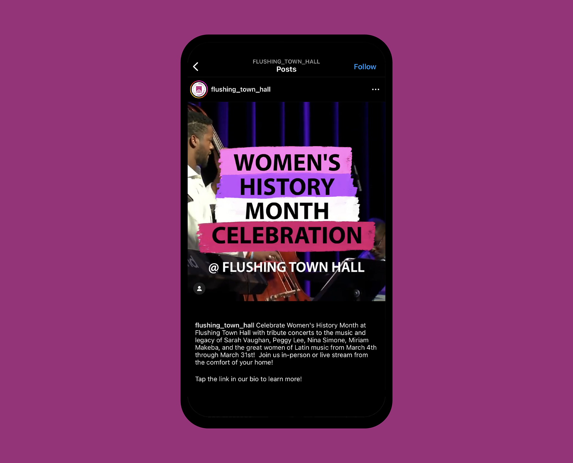 Design work for Flushing Town Hall spanned print, digital, social, and motion in support of concerts, educational initiatives, and multicultural arts programming. Each piece was designed to engage diverse audiences while reflecting the organization’s inclusive and community-driven mission.