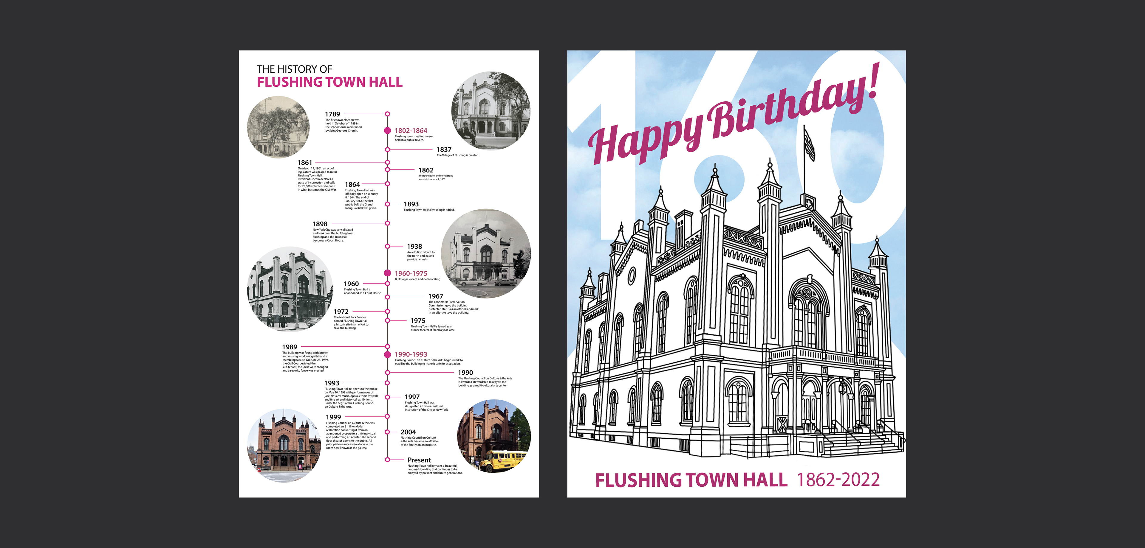 Consistent typography, color, and imagery tied together event materials across channels, with motion design used to promote performances and cultural events. Anniversary materials celebrating Flushing Town Hall’s 160th year balanced historical storytelling with a contemporary visual approach.