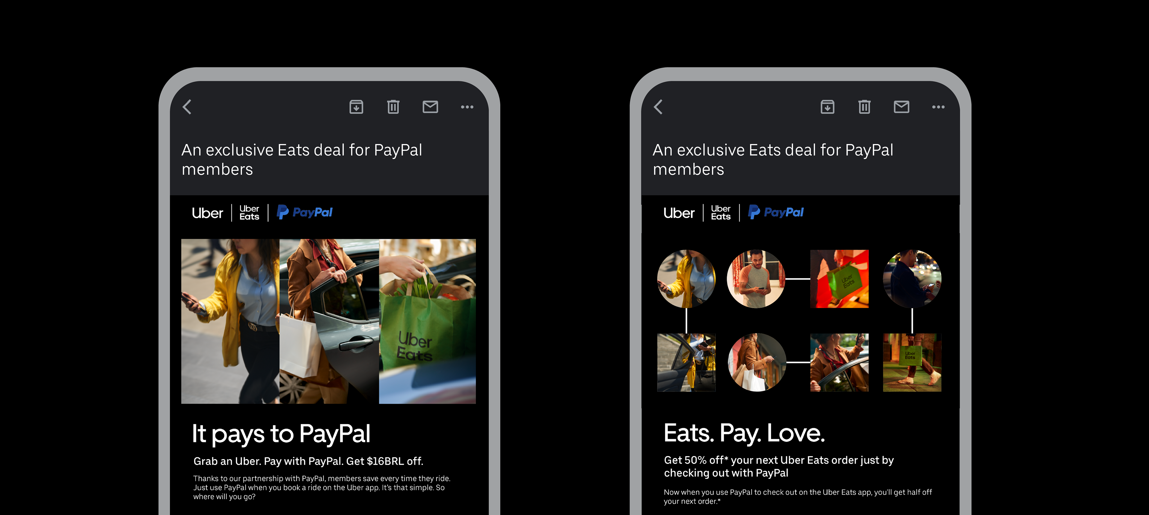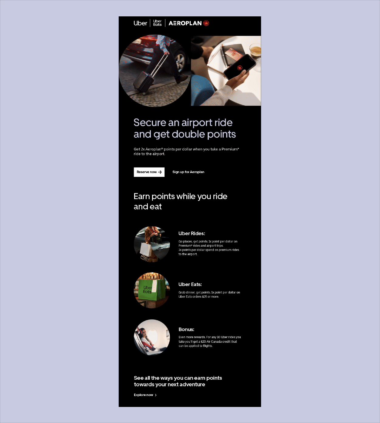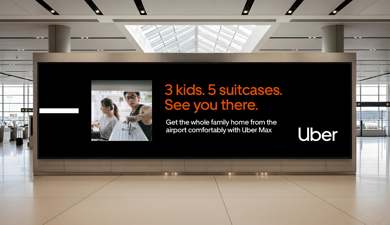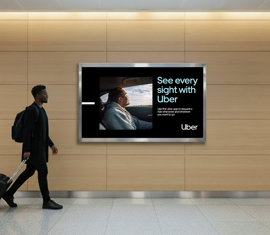 Curated imagery centered on movement and transit, featuring people on the go to reflect Uber’s focus on mobility. Together, the system and imagery translated seamlessly across emails and airport environments, creating cohesive, on-brand designs that highlighted key offers and guided users through moments of travel.